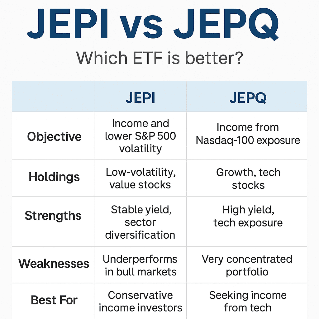 JEPI and JEPQ are two leading income-focused ETFs using covered call strategies, but they serve different investors. JEPI offers stable income with broad diversification and lower volatility, while JEPQ provides higher yield driven by tech exposure. Understanding their objectives, risks, and market behavior helps identify which ETF fits your strategy best.