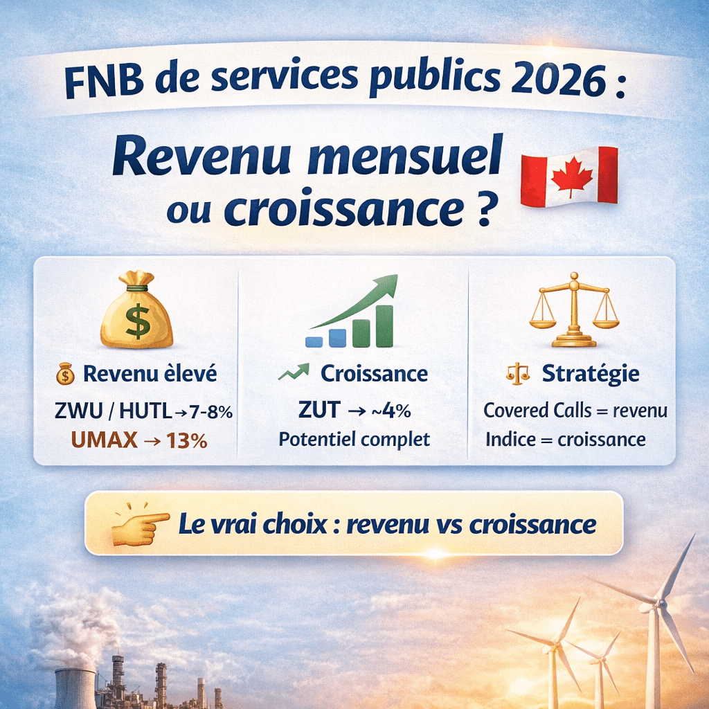 Cela dépend de votre objectif. Pour le rendement total et la croissance à long terme : ZUT. Pour le revenu mensuel : ZWU ou HUTL. Pour le rendement maximal : UMAX à 13.65%. Il n’existe pas de meilleur choix universel — tout dépend de vos priorités entre revenu, croissance ou combinaison des deux.