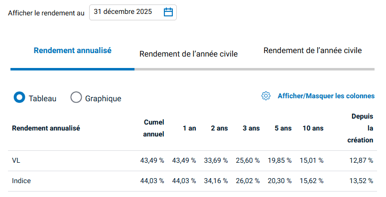 Le rendement passé n’est pas indicatif du rendement futur. Le rendement est présenté après déduction des frais, dans la devise de chaque catégorie d’actions, les dividendes étant réinvestis.